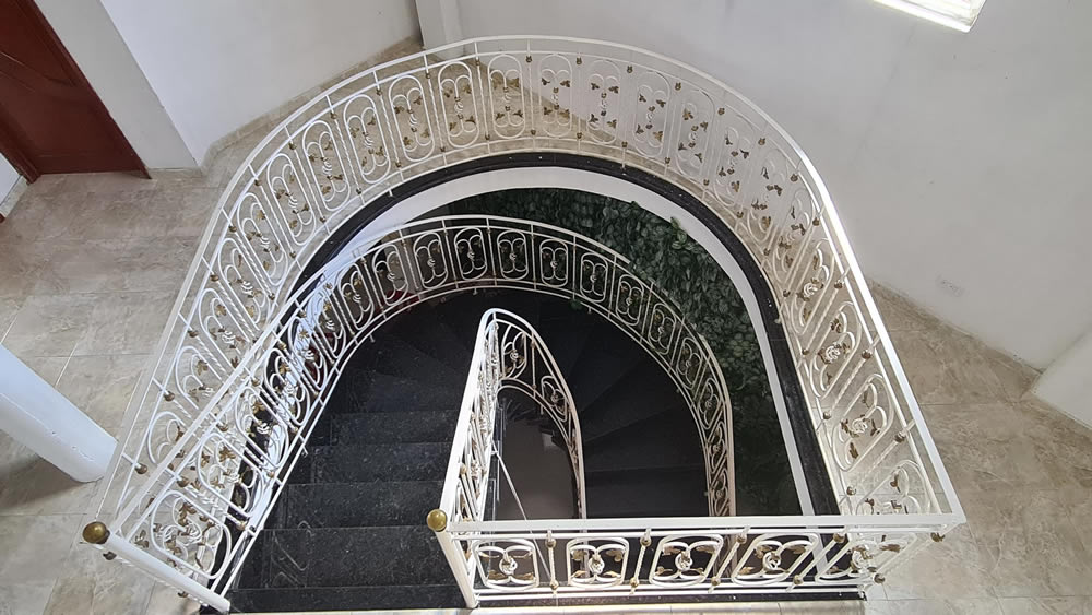 escalera de lujo en forma de herradura en hierro forjado y los pasos en mármol.