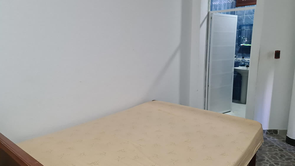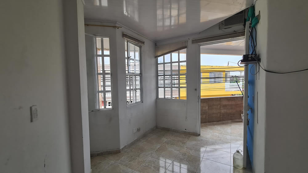 una habitación con balcón y cielo razo en icopor y baño privado.